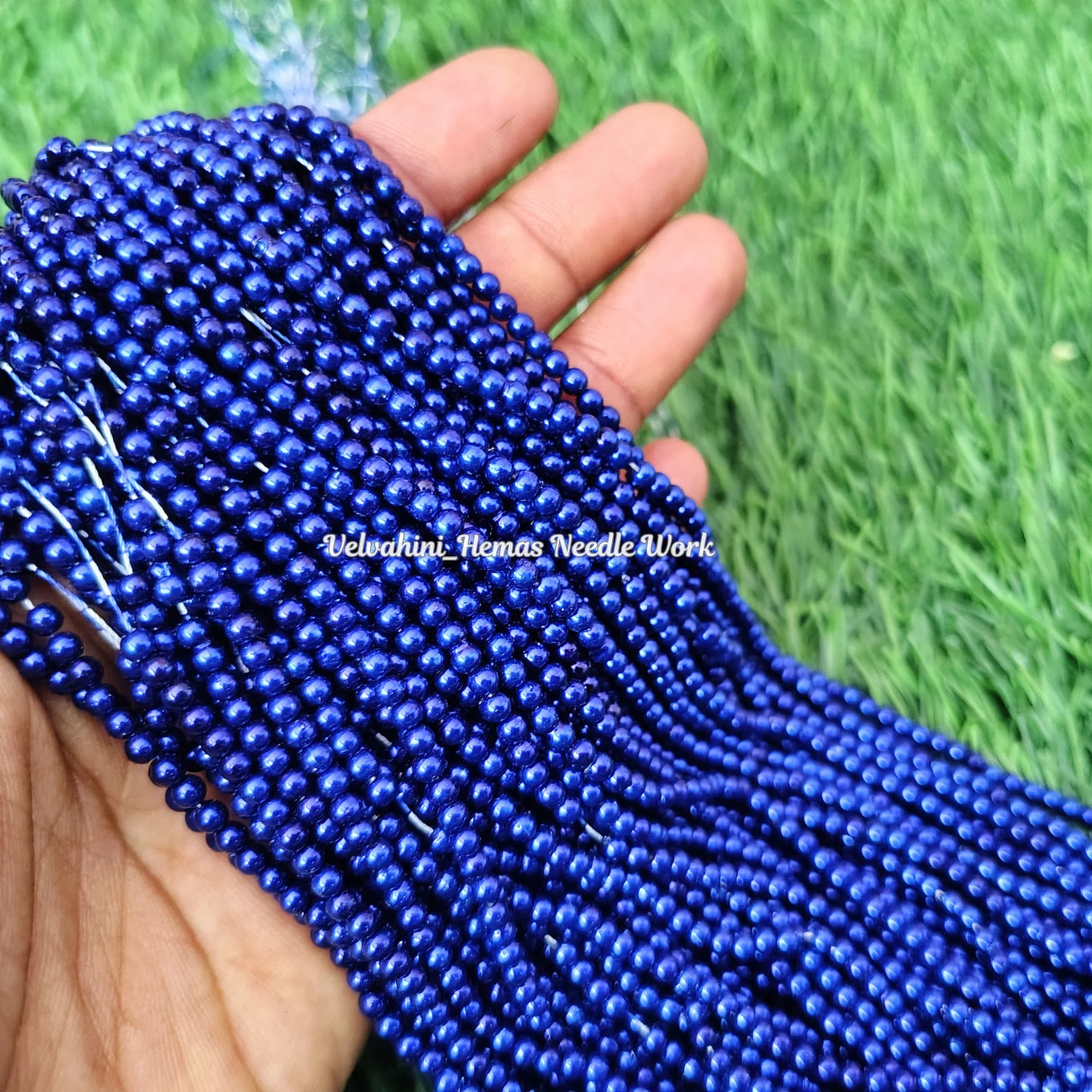 High-quality blue pearl beads ideal for Aari embroidery and handwork. Smooth finish with uniform size, perfect for adding a delicate and elegant touch to bridal, festive, and designer garments. Approx. 12 lines (1 bunch).