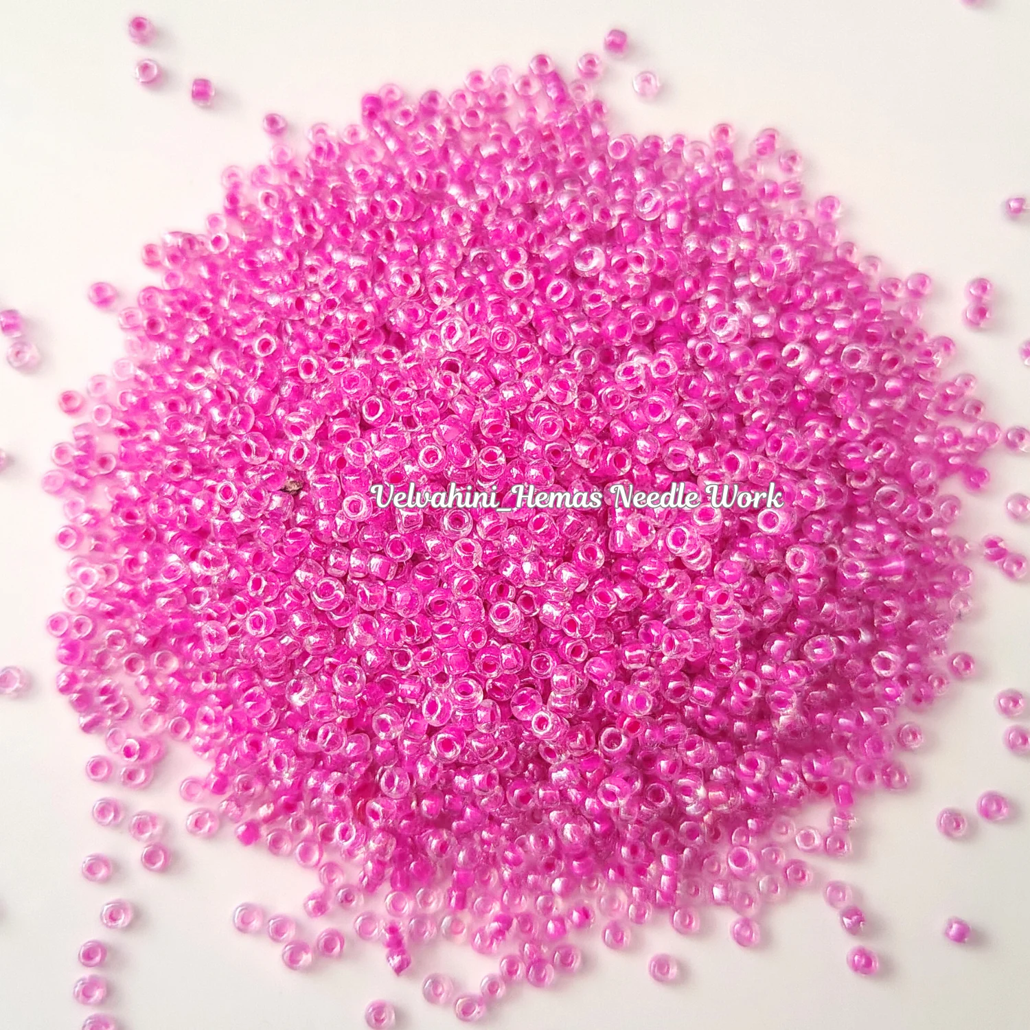 Glass sugar beads are small, shiny beads used in aari work to add sparkle and textured detail to fabric and embroidery designs.